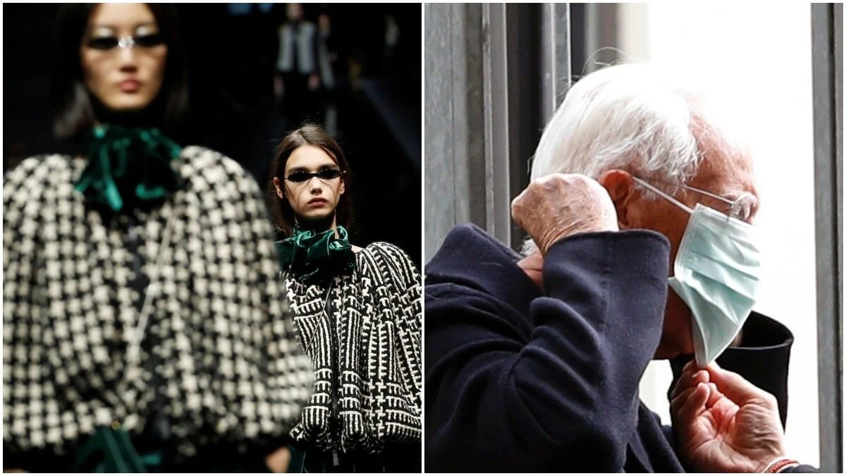 Models during Giorgio Armani's Autumn/Winter 2020 show at Milan Fashion Week (left), and the designer arriving to his show wearing a mask (right). via Insider